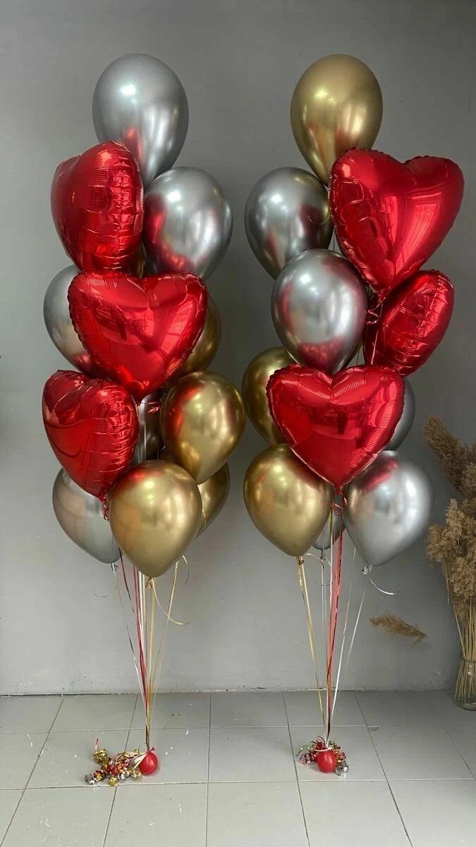 2 фонтана из 13 шаров (3 сердца 45см, 10 шаров хром)