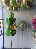 фонтан из 10 шариков: 2 сердца камуфляж, 1 звезда, 3 шара латексных камуфляж, 2 пастель зелёный, 2 шара хром зелёный, большой шар с индивидуальной наклейкой 15 шариков под потолок: 5 хром золото, 5 хром зелёный, 5 с конфетти золото