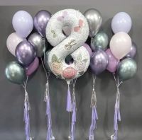 - 5 фонтанов по 5 шаров (зелёный хром, сиреневый хром, пыльно розовый пастель, алебастре пастель, сиреневый макарунс пастель) - цифра 102см цена 1 фонтана 710р