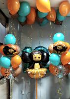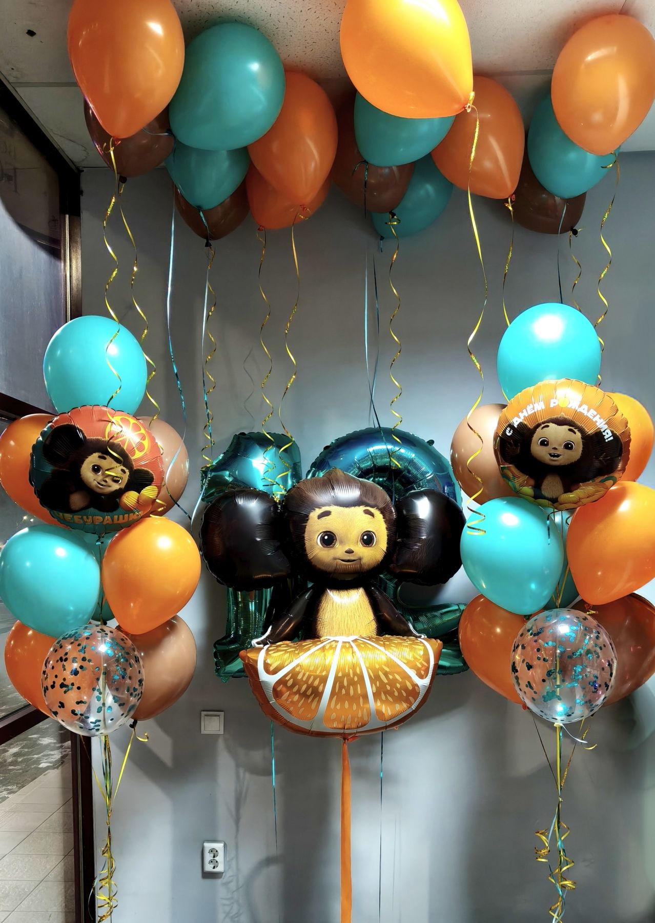 Для доставки используется ГРУЗОВОЕ такси! Состав: - 2 фонтана по 10 шаров (состав 1 фонтана: шар с конфетти, пастель коричневый 2шт, пастель бирюза 3шт, пастель оранжевый 3шт, шар фольгированный круглый Чебурашка) - Цифры баскийский зелёный, 2 шт - фигура фольгированная Чебурашка - фигура фольгированная долька апельсина - шары под потолок: бирюза 5шт, оранжевый 5шт, коричневый 5шт