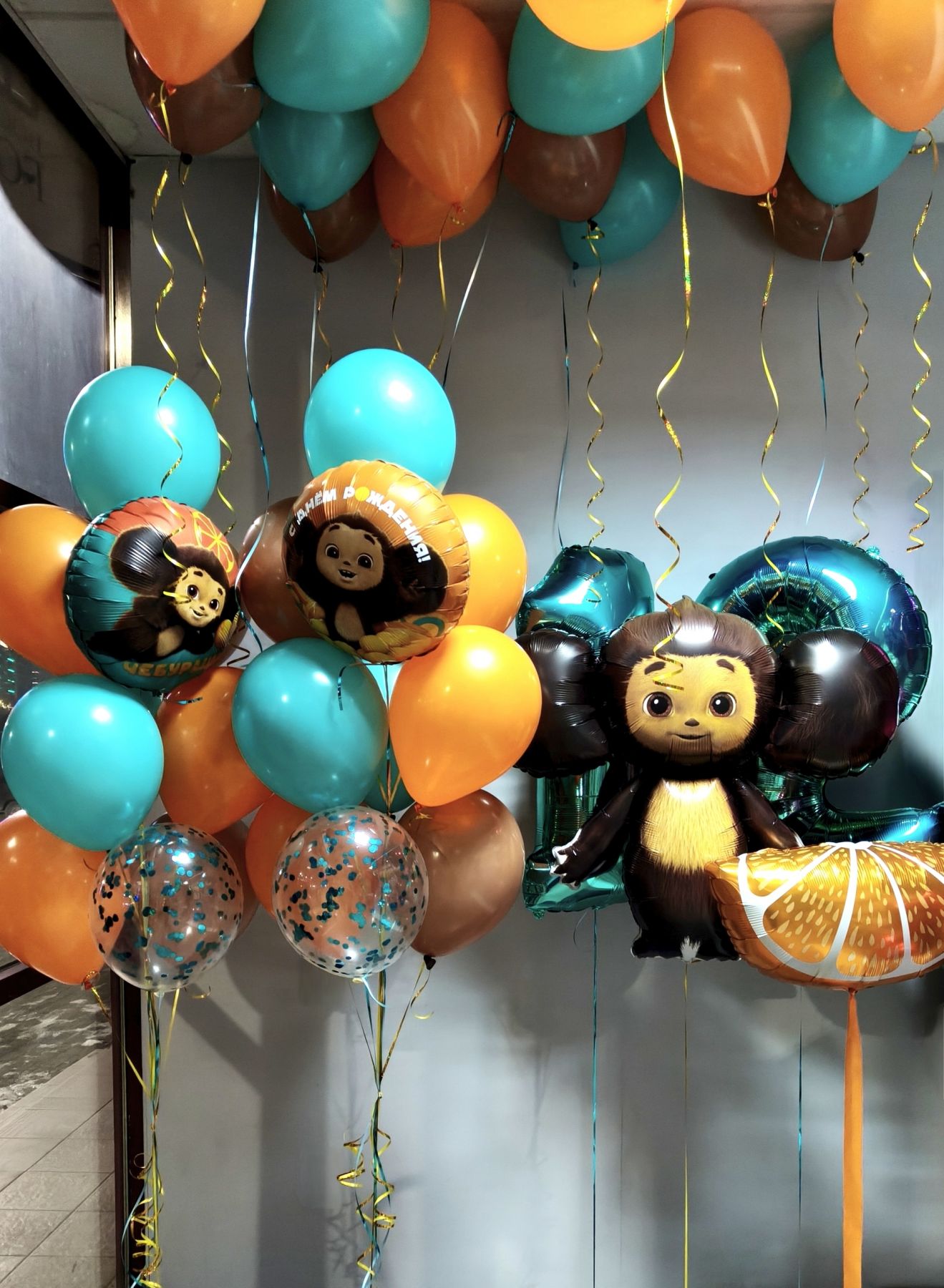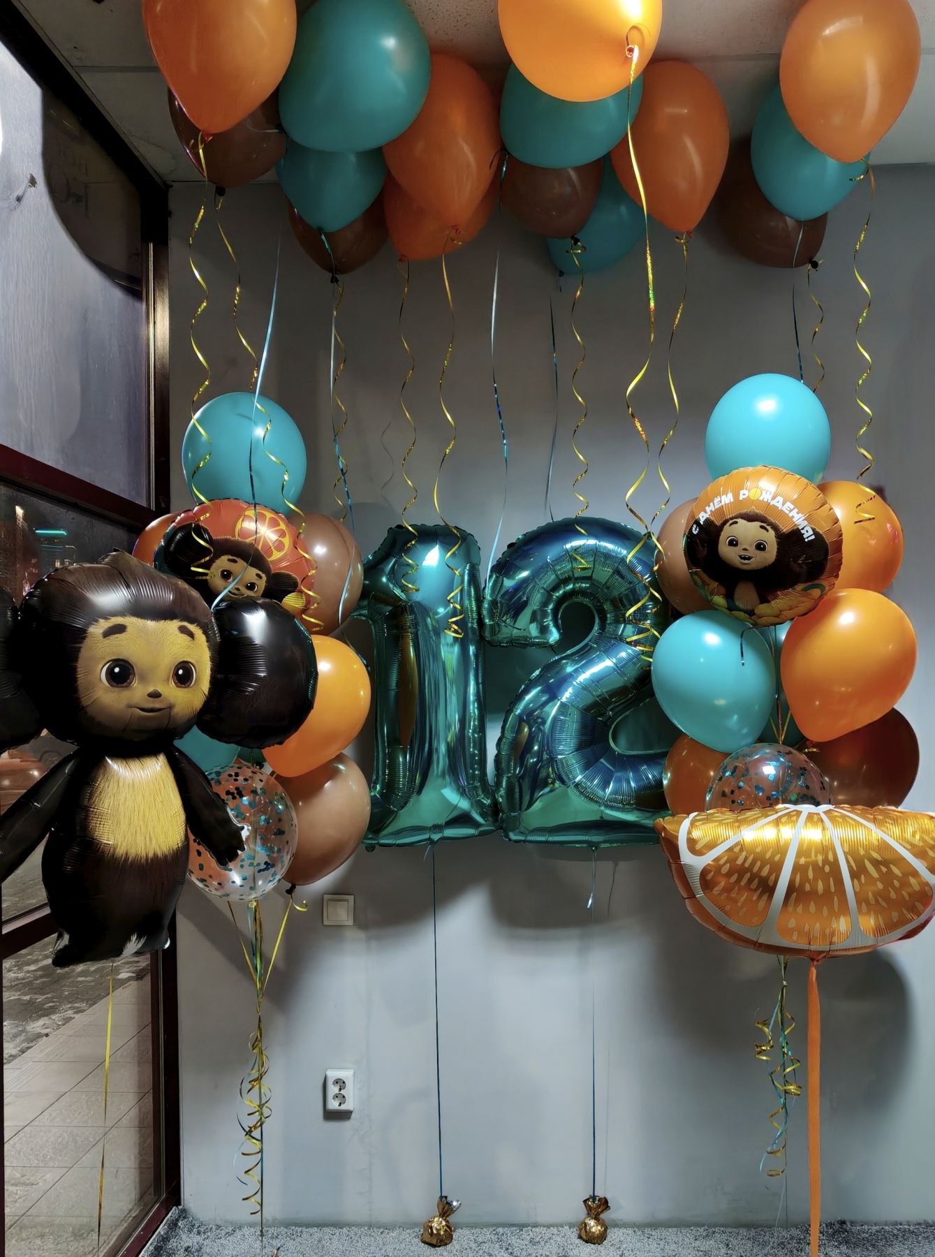 Для доставки используется ГРУЗОВОЕ такси! Состав: - 2 фонтана по 10 шаров (состав 1 фонтана: шар с конфетти, пастель коричневый 2шт, пастель бирюза 3шт, пастель оранжевый 3шт, шар фольгированный круглый Чебурашка) - Цифры баскийский зелёный, 2 шт - фигура фольгированная Чебурашка - фигура фольгированная долька апельсина - шары под потолок: бирюза 5шт, оранжевый 5шт, коричневый 5шт