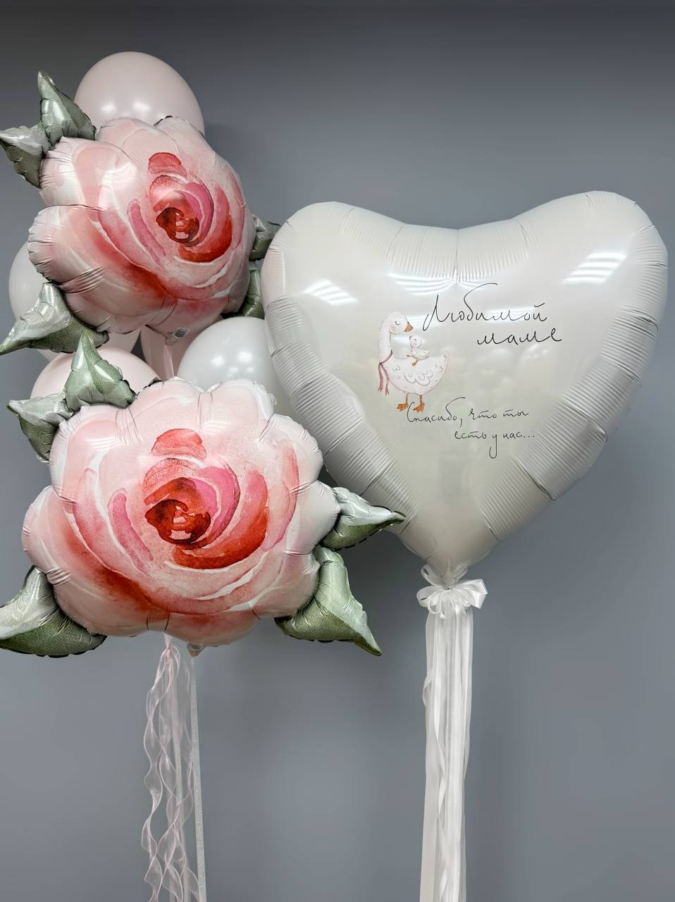 состав: -Фонтан из 7 шаров (6 латексных кремовых шаров и цветок) -Цветок -Сердце 90см с наклейками -Ленты атласные