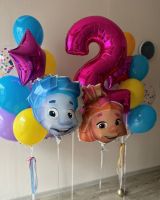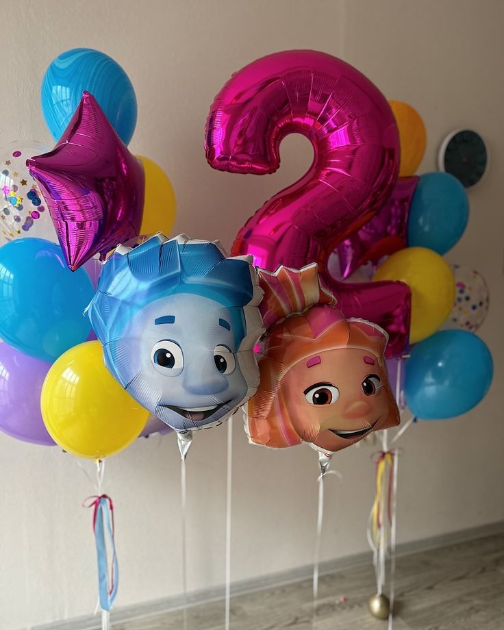 Состав фонтана: звезда малиновый, пастель жёлтый 2шт, пастель сиреневый 3шт, пастель синий 2шт, шары с конфетти 2шт. Цифра малиновый. Головы фиксиков 2шт.