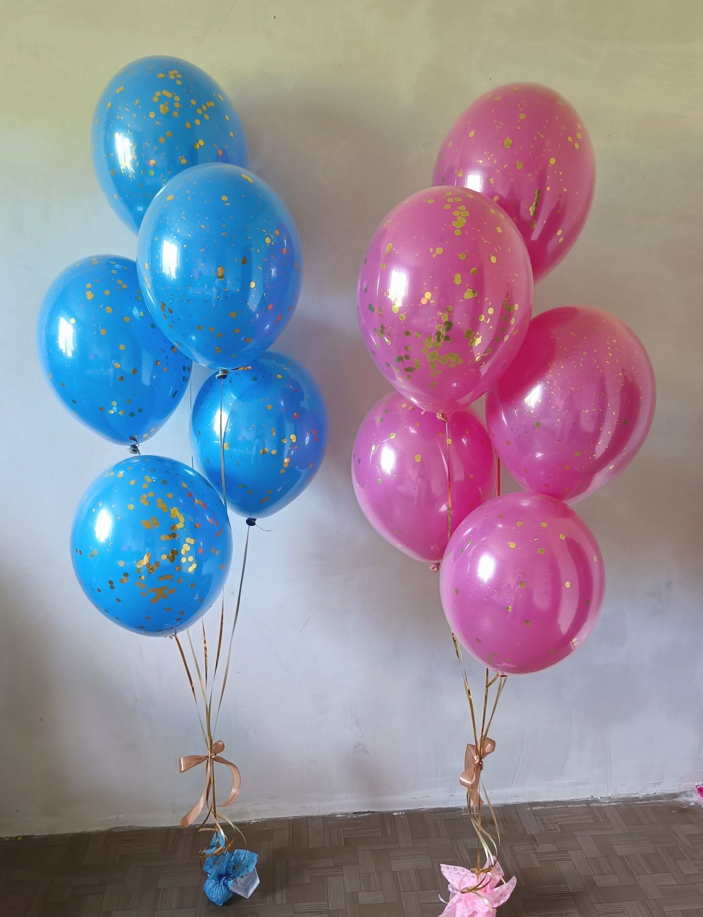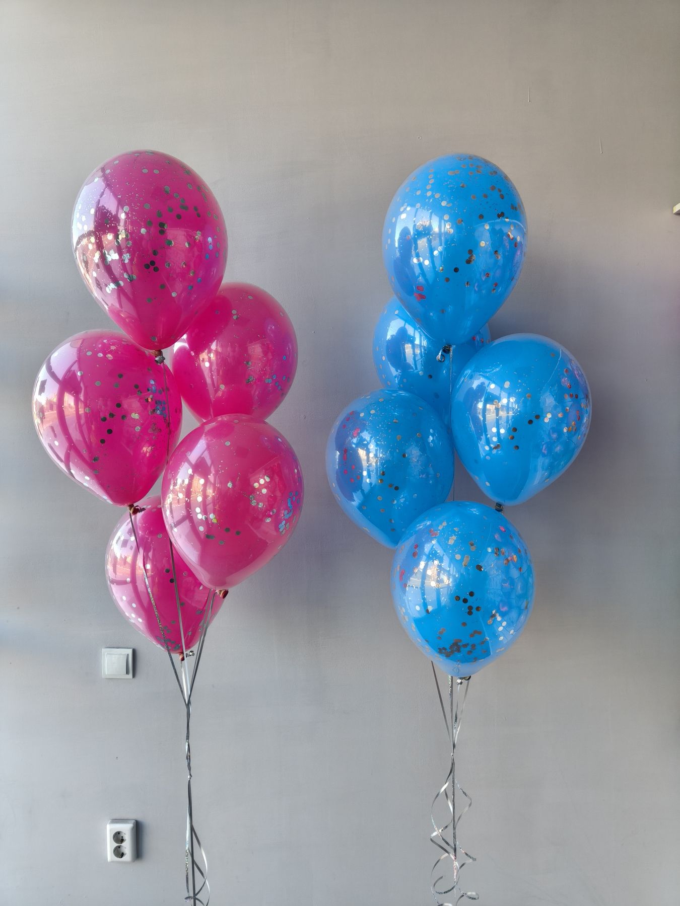 2 фонтана по 5 шариков На фото представлен вариант синий и малиновый, 1 фото конфетти золото, 2 фото конфетти серебро