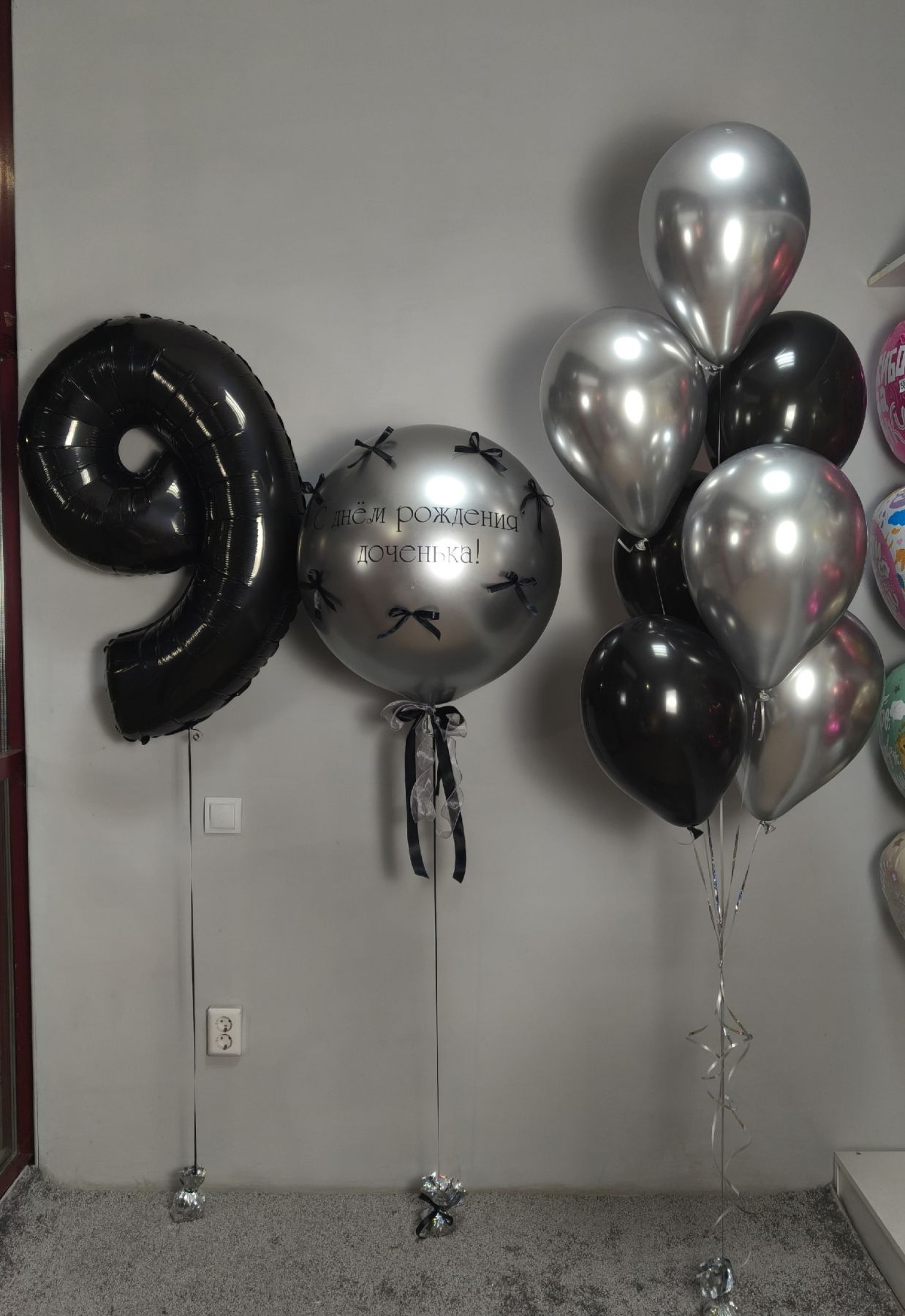 Фонтан из 7 шариков Большой шар серебро с надписью и бантиками Цифра Цветовую гамму и надпись можно изменить по желанию заказчика!