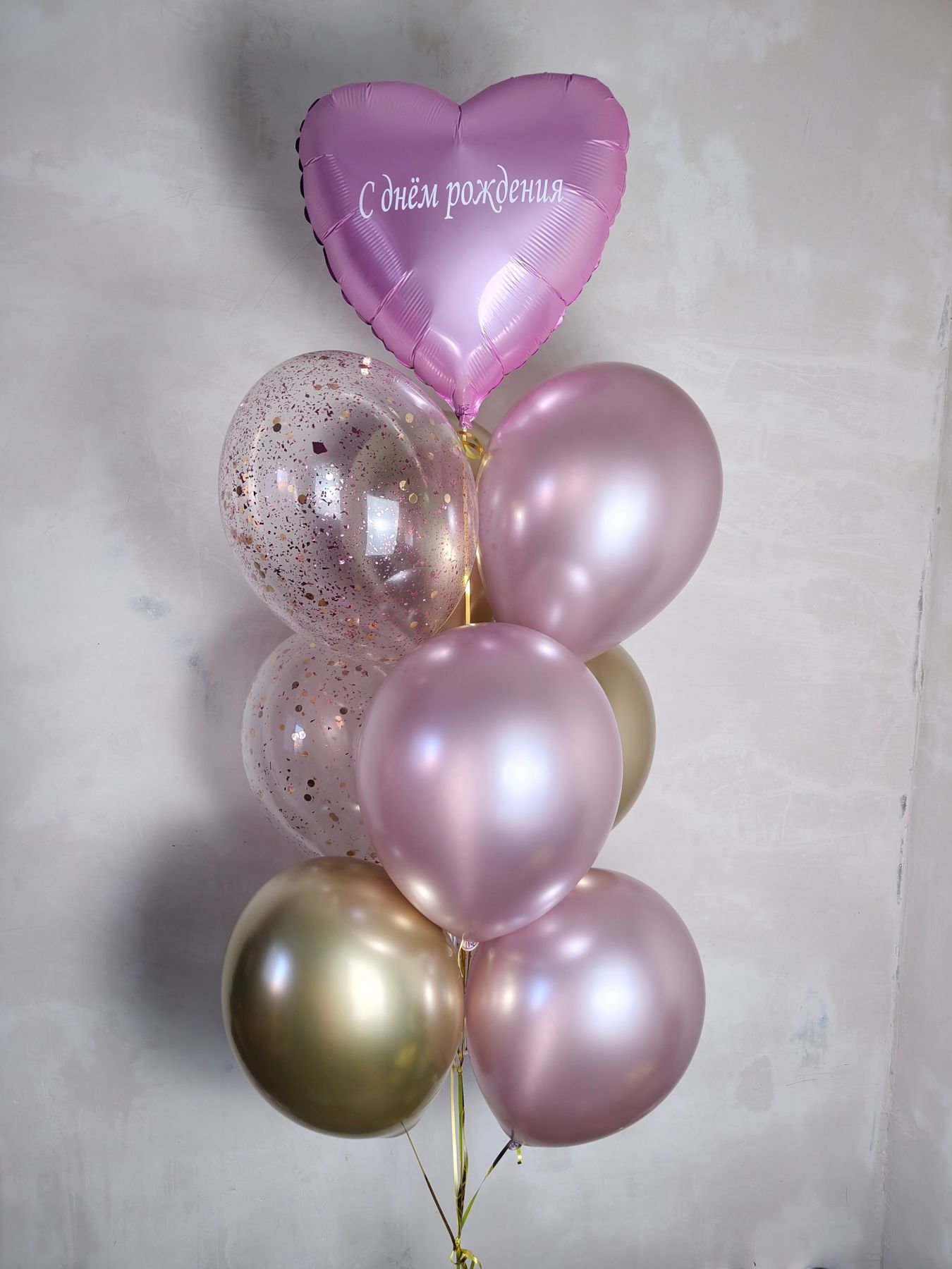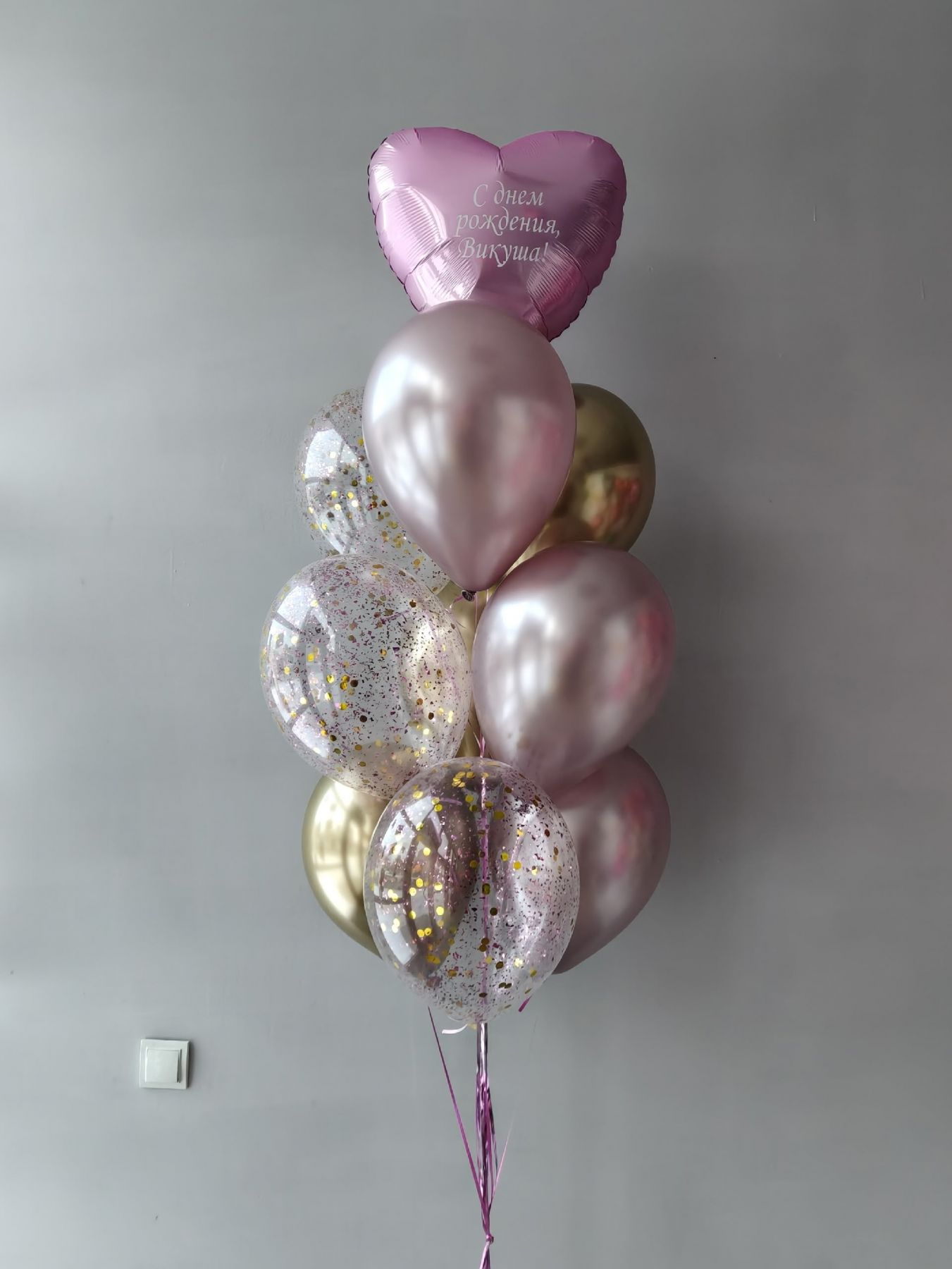 Фонтан из 10 шариков - 3 шара хром золото - 3 шара шёлк розовый цветок (меняют оттенок в зависимости от освещения) - 3 шара с конфетти
