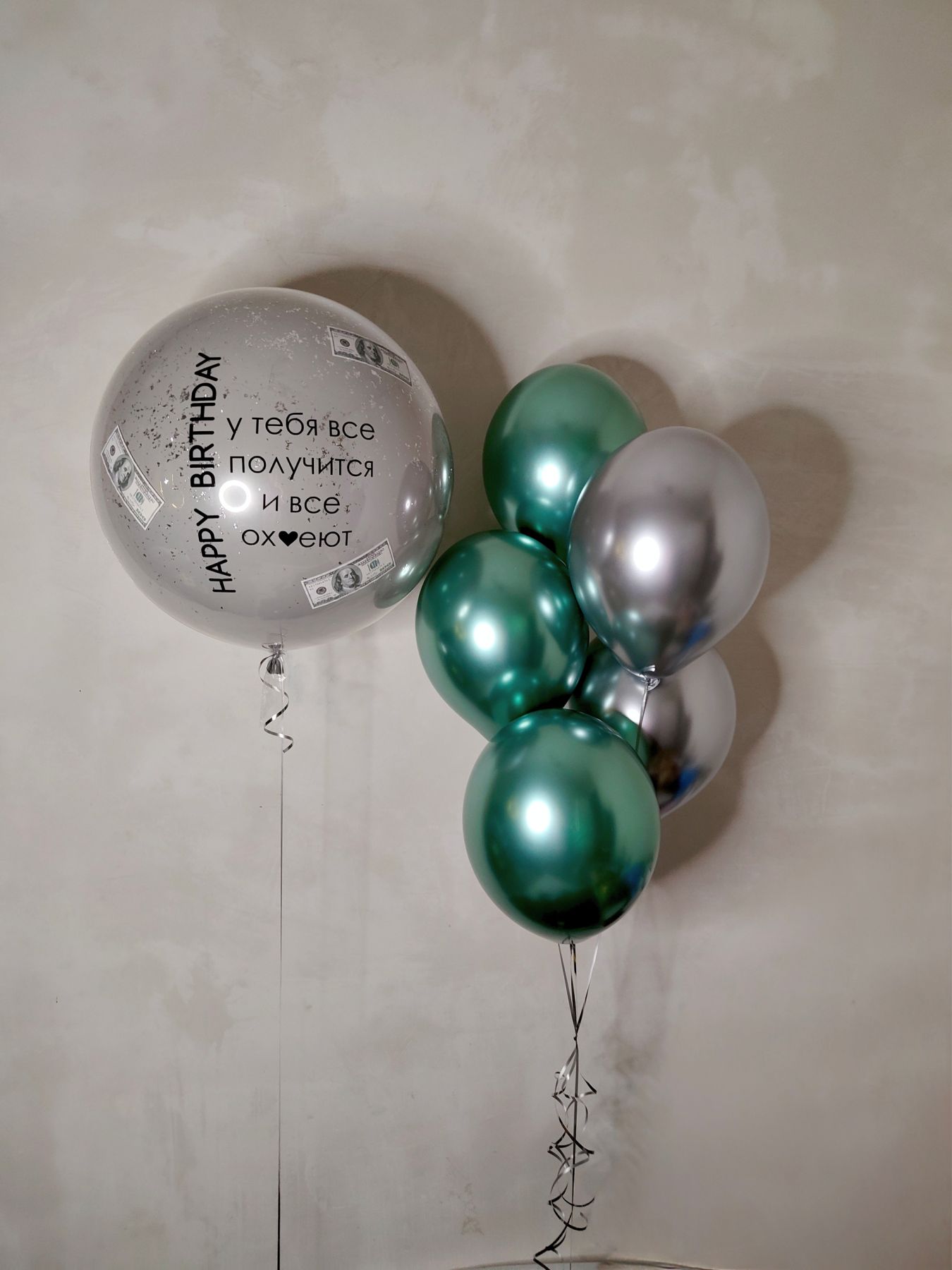 Возможна смена цветового сочетания и надписи Состав: - шар кристальный с конфетти серебро, наклейками и надписью - шар хром серебро, 2шт - шар хром зелёный, 3шт