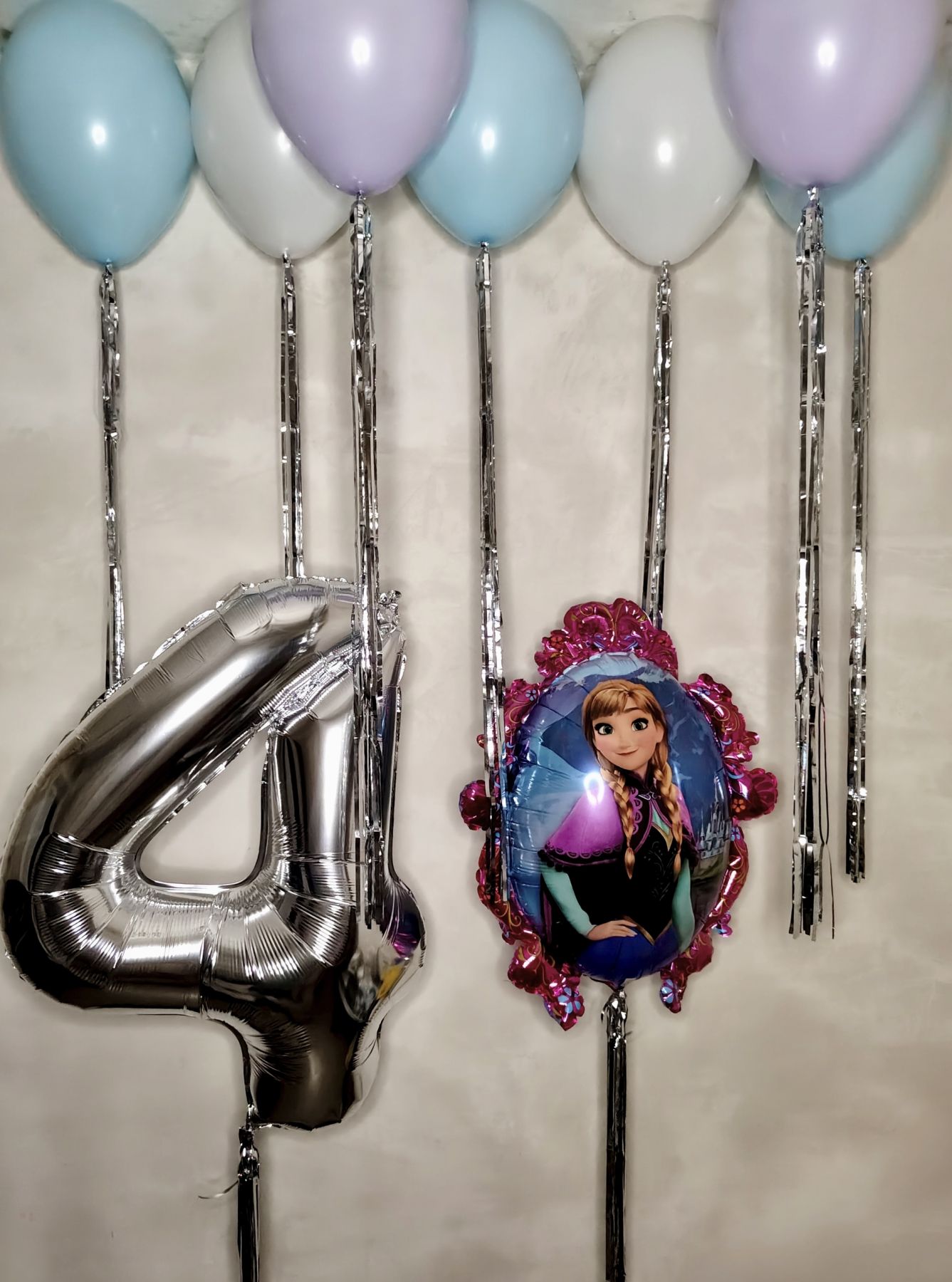 • Фигура Холодное сердце • Шары пастель: сиреневый 2шт, белый 2шт, голубой 3шт • Дождик серебро • Цтфра серебро 102см