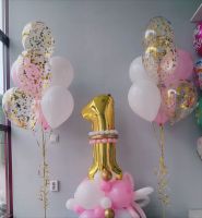 цифра на подставке и 2 фонтана по 7 шариков (форма и размер конфетти может быть изменены, цветовая гамма композиции может быть изменена)
