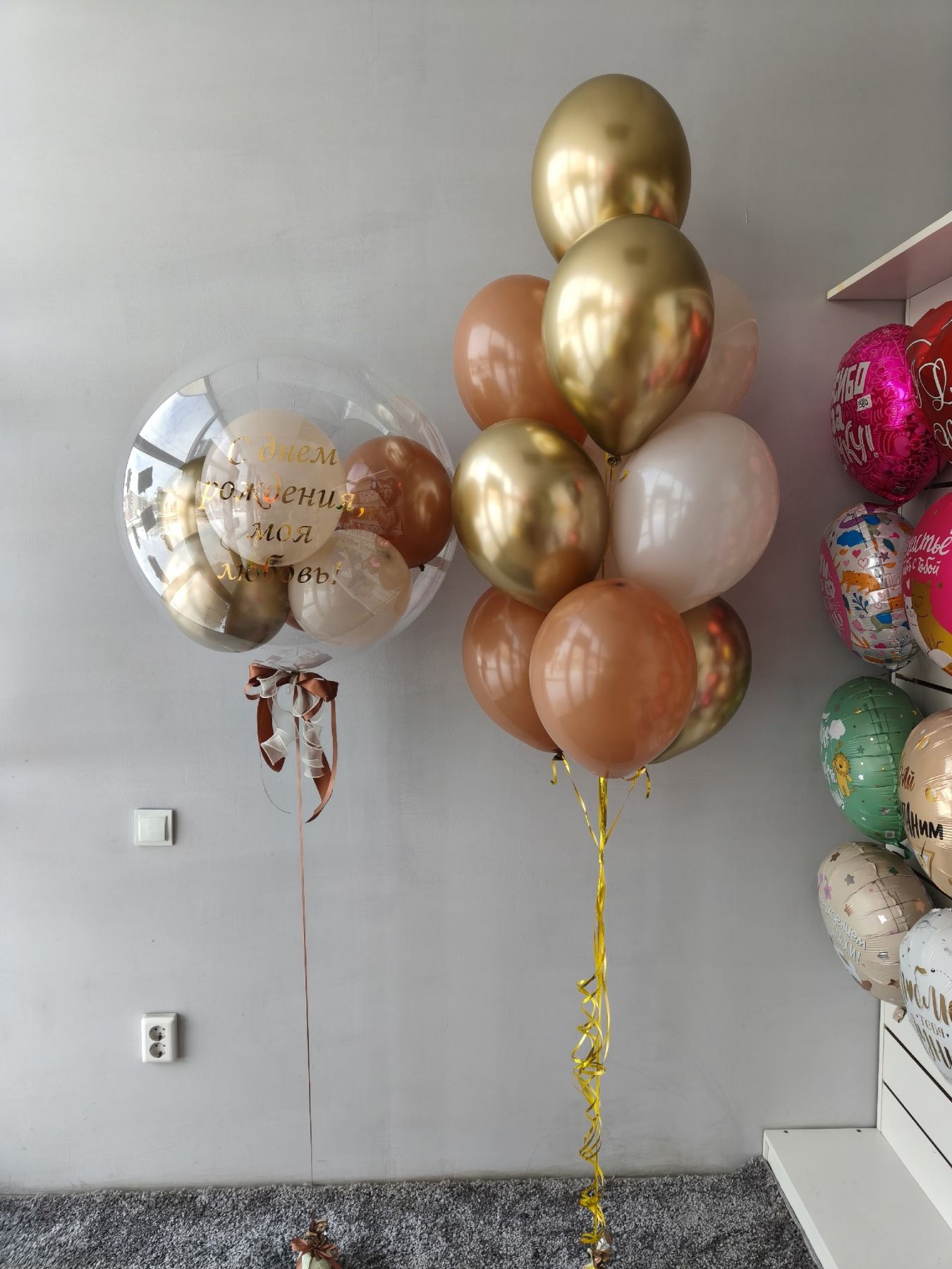 Набор состоит: Фонтан из 10 шаров ( 4 шара хром и 6 однотонных шаров) Большой бабл шар с надписью( Надпись может быть любой)