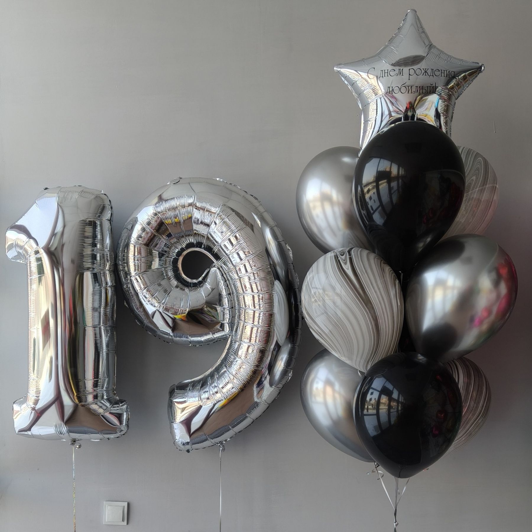 Набор состоит из: 2 любых цифр, Фонтан из 10 шаров: звезда с надписью (надпись может быть любой), 3 хром, 3 агат, 3 пастель