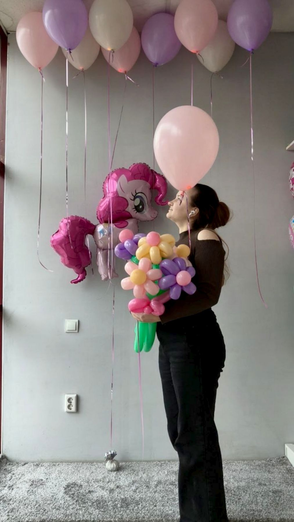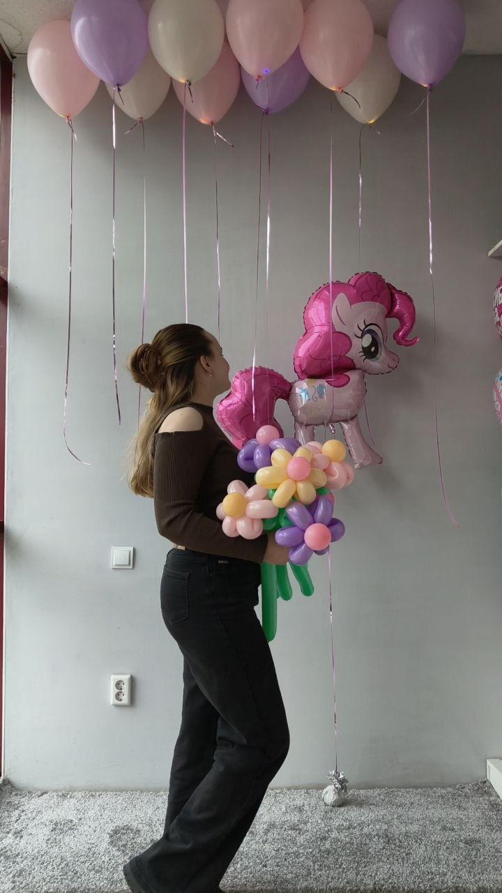 Состав: - Пони (можно изменить фигурку) - Светящиеся шарики (шарики пастель, с диодами) - букет из 5 ромашек разного цвета