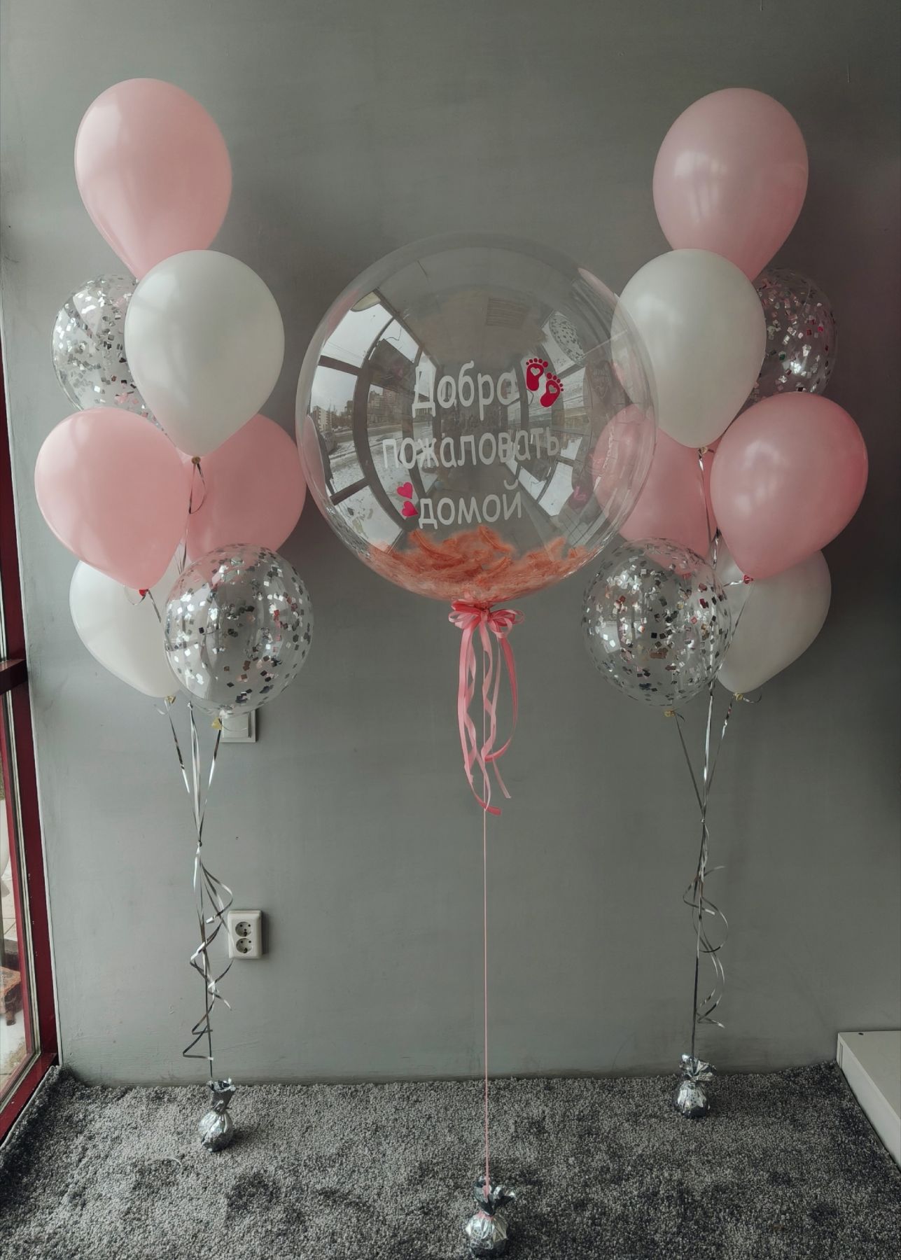 Композиция состоит из : 2 фонтана из 7 шаров бабл шар с надписью ( надпись может быть любой)