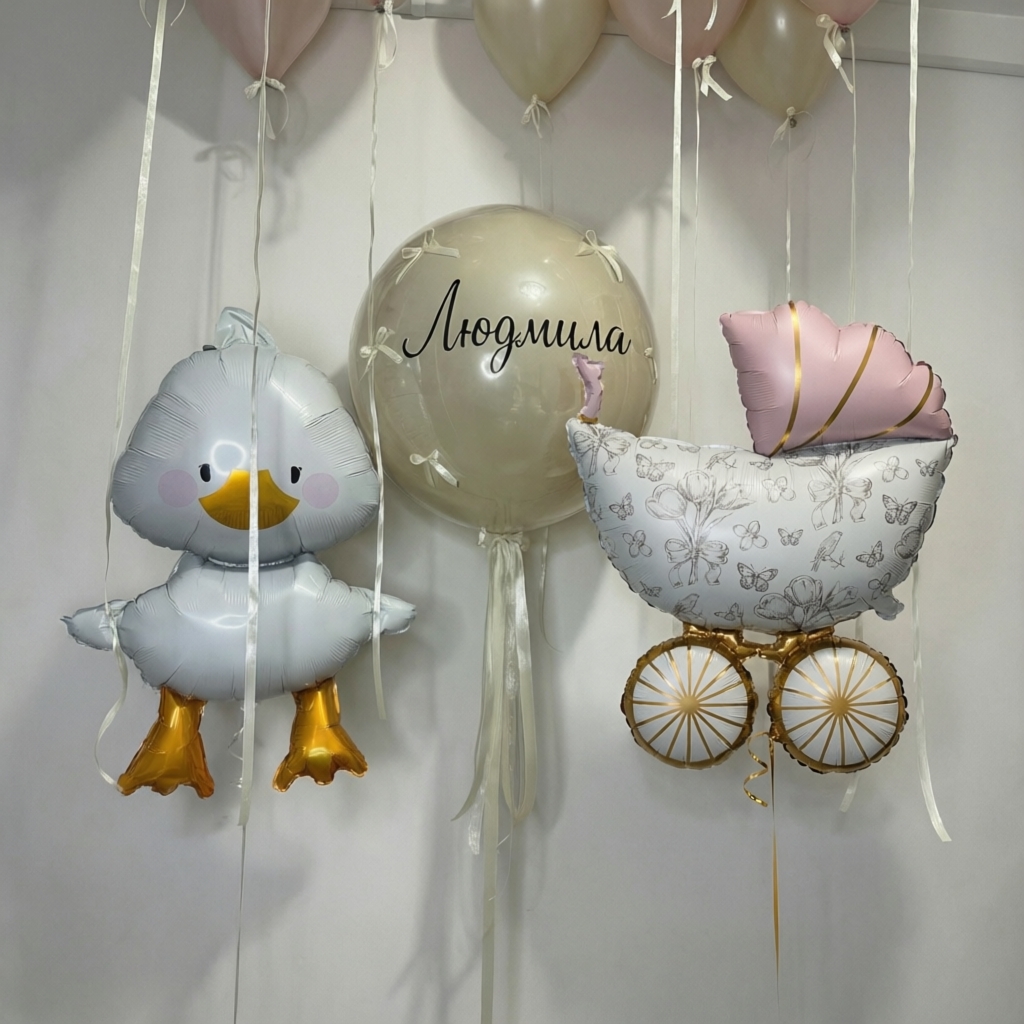 В состав набора входит: - шар в потолок на атласных лентах, 10 шт (пастель белый песок, 5 шт; пастель розовый, 5 шт); - Стеклянный шар белый песок, с надписью и бантиками - фигура коляска, 1 шт; - фигура уточка, 1 шт.