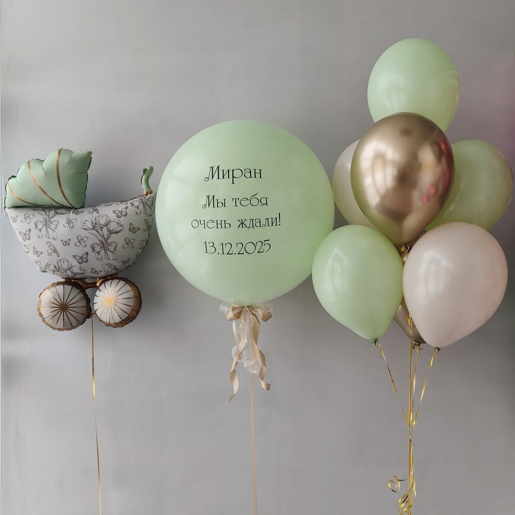 В состав набора входит: - фигура коляска, 1шт; - шар 90см Мятный с индивидуальной наклейкой, 1 шт - фонтан из 7 шаров (шар пастель мятный, 3шт; шар пастель кремовый, 2шт; шар хром золото, 2шт)
