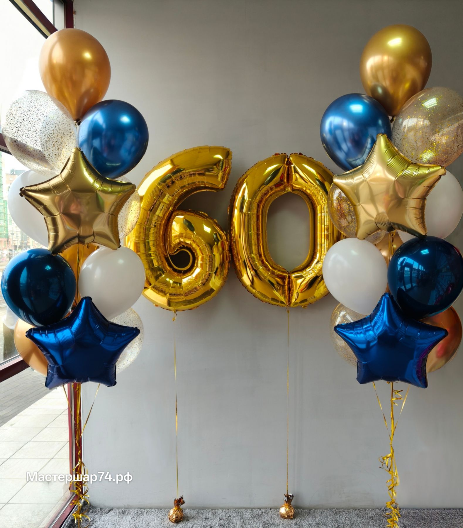В набор входит 2 цифры (102см) 2 фонтана по 12 шаров Состав 1 фонтана: 4 шара хром (35см) 3 шара с конфетти (35см) 3 белых шара (35см) 2 фольгированных звезды (45см) 1 дабл стафф (чёрный + синий кристалл)